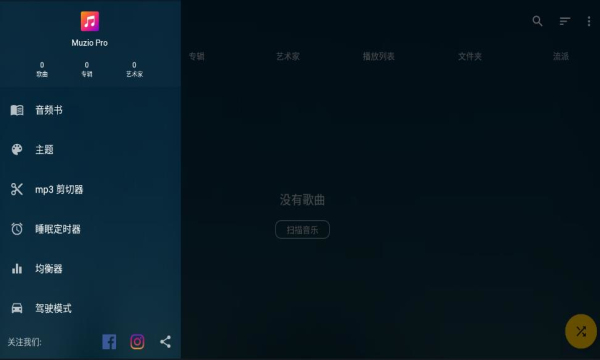在左上角的三道横杆中,可以查看当前歌曲、专辑和艺术家的数量,同时音频书、主题、mp3剪切器、睡眠定时器、均衡器以及驾驶模式、隐藏文件夹、扫描音乐和基本设置、常见问题都能在此界面中进行自定义修改。