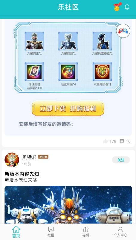 乐社区是一款专为奥特曼玩家打造的自己社区,平台提供了海量丰富的奥特曼内容,在这里可以获取到有关它的最新资讯,有机会的话还可以领取奥特曼游戏礼包,平台上也有超多的游戏达人入驻在此,大家可以根据自己的喜好自己加入社区参与讨论,是游戏迷们的必备软件。