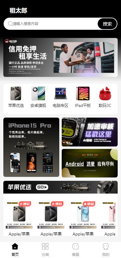 租太郎app是一款以数码产品出租为主的手机软件,拥有市面上最齐全最新型号的数码产品,不管是手机、电脑、相机、电竞设备和游戏机等等,这里应有尽有,不管你需要什么型号的设备,这里全都有,而且价格公道透明,如果你的信用分够高,甚至以不要押金,租借时间长,达到一定期限直接将机器送给你!