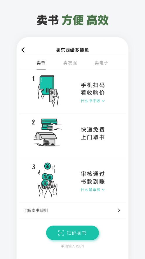多抓鱼二手书店app是一款主打二手书籍买卖的软件,除了二手书籍之外,也是一款良心的生活耐用品循环商店,你闲置的各种生活用品都能通过该平台进行估价然后出售,比如衣服、数码产品、书籍和手办等等。手机扫码看价收购,会有专门的快递人员上门回收,然后平台专员会对你出售的东西进行审核,审核通过书款到账!