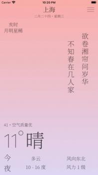雨时是一款天气应用,与多数图像化的天气应用不同,雨时的信息基本以文字的形式展现,并配以古诗词,颇具中国风韵,可以说是一款「富有诗意」的应用。