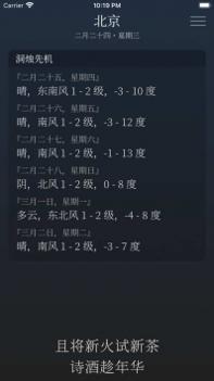 雨时的主界面涵盖的信息还是很全面的,地点、时间、天气、温度、风力等一应俱全,不过目前雨时还不能自动定位,需要在右上角的菜单中添加城市。除了这些以外,雨时还有一些属于它自己的元素,首先看到的就是右边竖排的两行诗,然后左上角还会有地支计时及相应的时间短语。