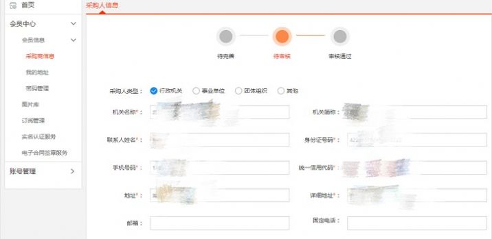 1、根据采购单位性质选择采购人类型,并按要求逐一填写机关名称、联系人姓名等信息。