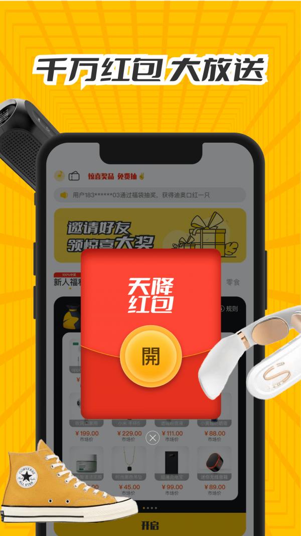 1、天天福袋是一款好用的线上购物平台,拥有许多福袋,新人注册可以免费开福袋;