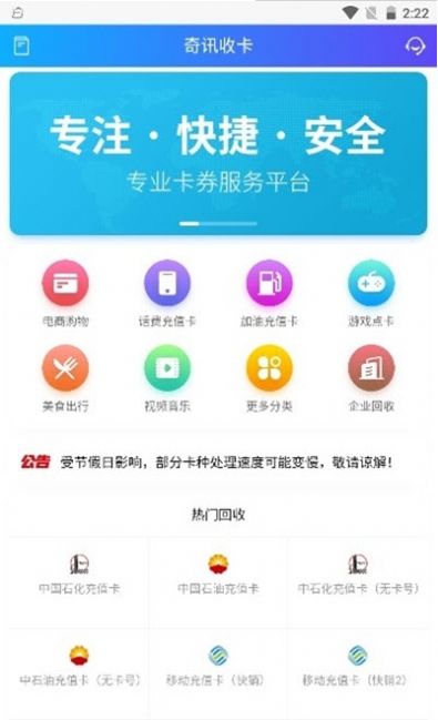 1、提供加油卡、话费卡、超市卡等代金卡券的回收服务,一键回收实时到账。