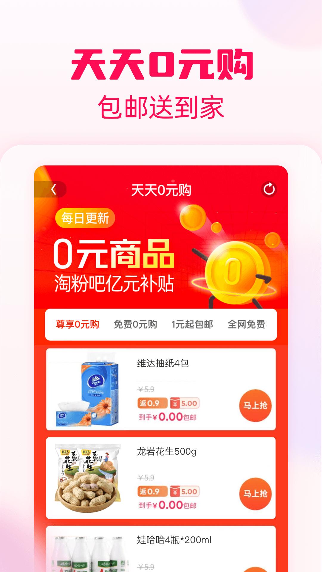 3、应用的主界面包括多种功能,如0元秒杀、超实惠、9.9包邮、品牌特卖、商城返利、充值返利、返利订单、签到摇奖等。