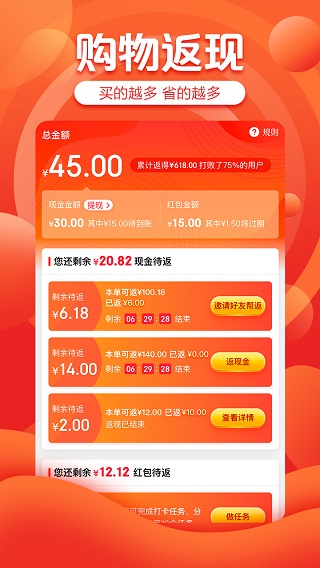 6、购物返红包:全新上线购物返红包玩法,下单即得无门槛红包,买多返多!