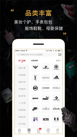 品类丰富:美妆护肤、个人护理、手表配饰、箱包手袋、服装服饰、时尚鞋靴、母婴儿童、营养保健八大品类;