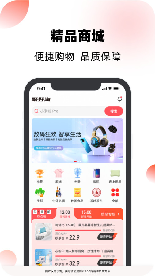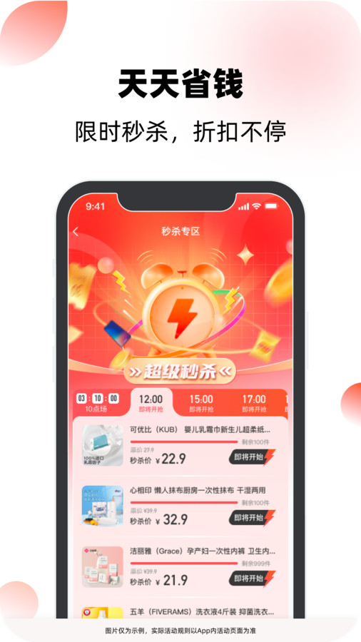 3、能不间断的举办购物的活动,促销商品随时省钱下单应用。