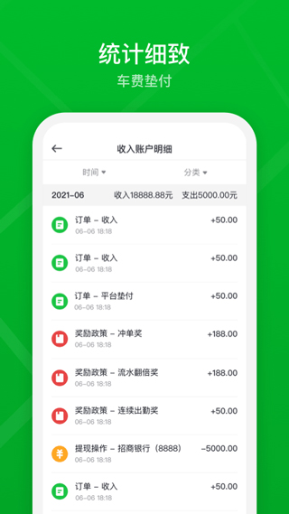 冲单奖励、高峰奖劢、流水奖励……奖励活动丰富;订单统计细致、结算周期自由选择。