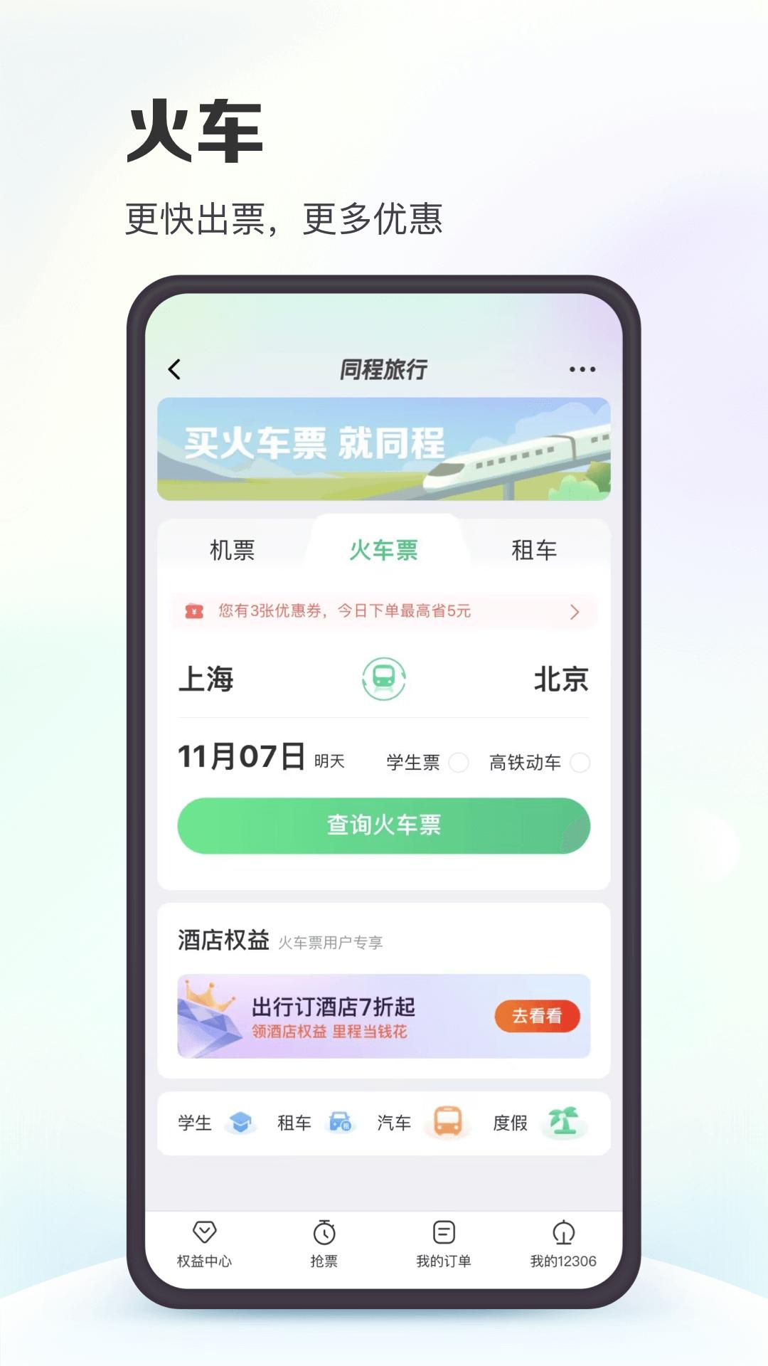 火车票:购票便捷,支持在线抢票、在线选座;票种多样,支持成人票、儿童票、学生票;智慧出行,只能推荐火车中转、多买几站、同车换乘等出行方式。