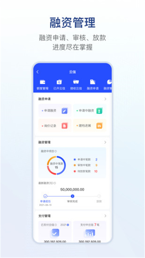 融资管理功能就是帮助用户将各项融资的实时状态数据信息进行在线管理的功能
