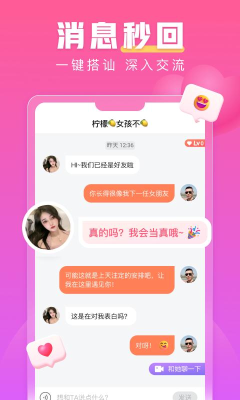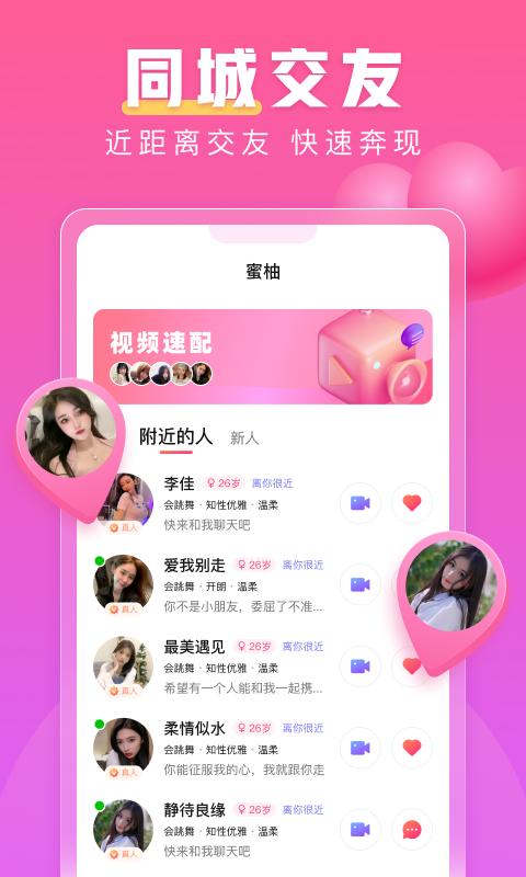 蜜柚交友是一款非常值得用户信赖的聊天交友软件平台,里面的所有用户都是经过个人实名认证,保证交友环境的真实性,让你可以放心的参与其中,蜜柚交友搭载实时定位功能,为你推荐附近的优质用户,让你们可以快速进行奔现约会,拉进彼此的感情,从而解决单身的问题,有需要脱单的用户赶紧下载体验试试看吧!