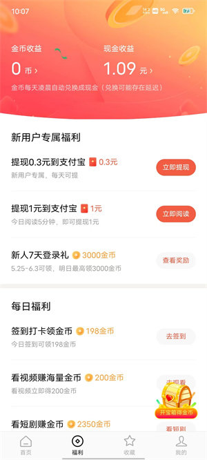 5、每日福利任务,每天看短剧、阅读小说都可获得金币,金币兑换比例为33000:1。