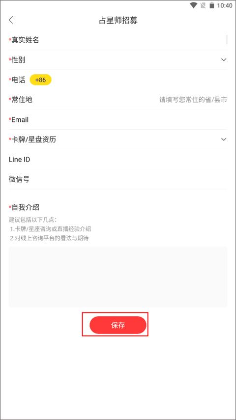 2、在占星师招募界面填写你的真实姓名、性别、电话、常住地、email、卡牌/星盘资历等具体信息,再输入自己的个人介绍内容,之后点击保存就可以了。