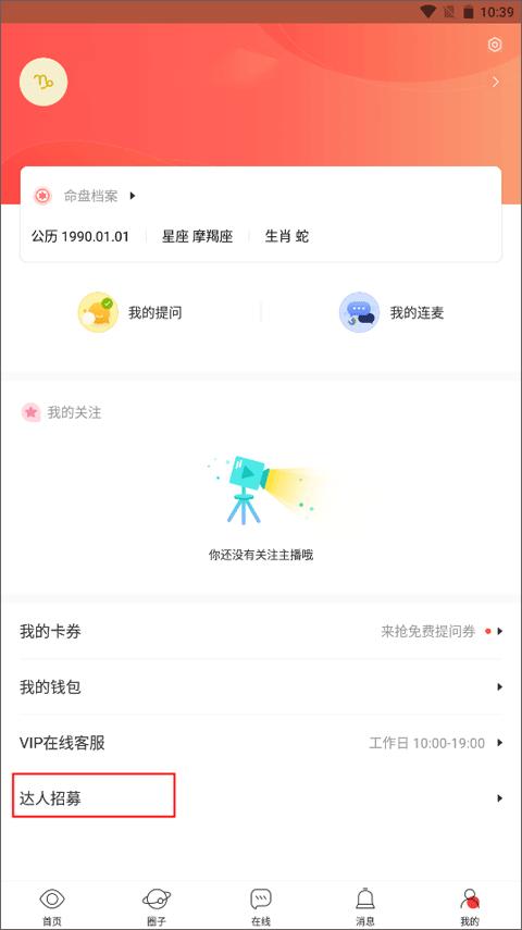 1、打开app并进入【首页】,点击切换到【我的】界面,在这里你可以看到我的卡券、我的钱包、VIP在线客服、达人招募等,选择“达人招募”功能。