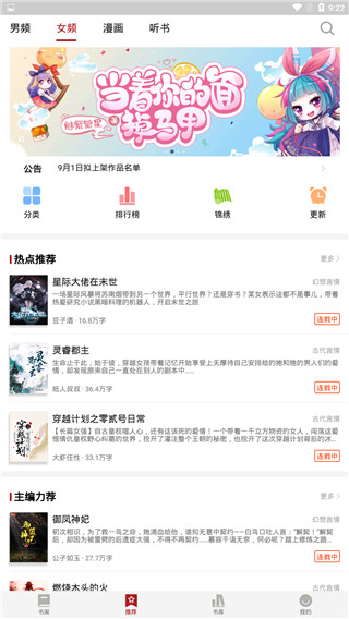 2、在推荐这里,有男频、女频、漫画、听书、分类、排行榜等;
