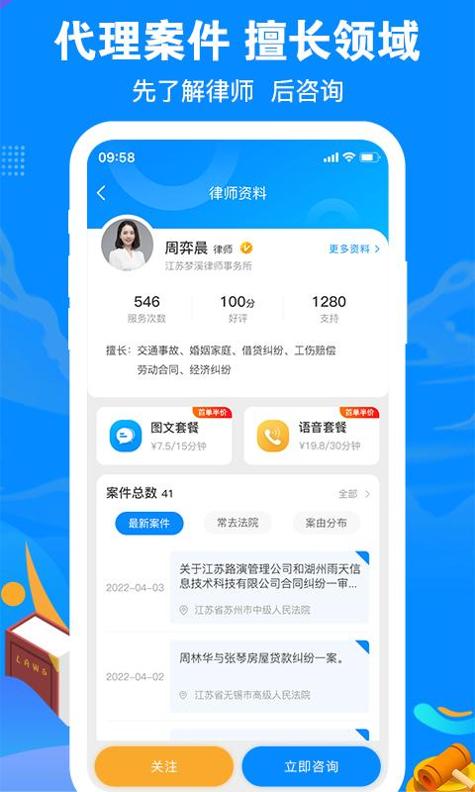 3、律师信息多维度展示:通过展示律师事务所、专业、教育经历、服务记录、资历等,介绍心仪的律师。