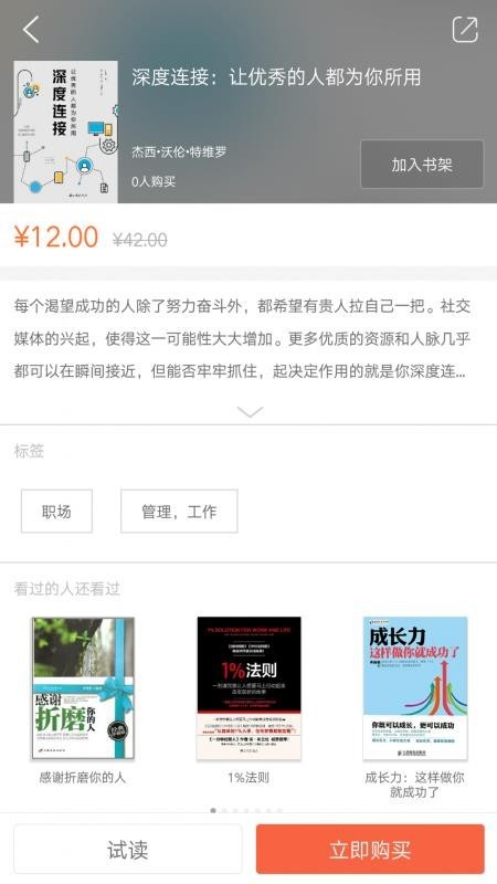 支持买前试读,当自己选择电子书籍的时候可以先试读一小部分再决定要不要购买;