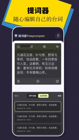 2、提词器辅助:创新集成提词器功能,用户可自定义台词内容、调整字体大小,满足演讲、录制等场景需求,提供高效便捷的台本管理工具。