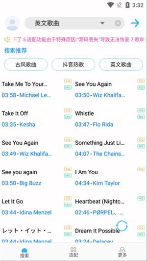 1、打开歌词适配app,在搜索框中输入歌曲名称关键字。