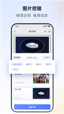 2、一键即可出审查结果,如图中的标点符号错误以及涉政信息,通过Ai精准审核文本内容,挖掘错误、规避风险,无论什么场合都用得上