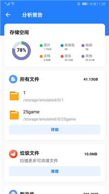 4、下方为手机的内存使用情况,可以进行扫描和清理操作,扫描结束后还会出具详细的分析报告,可以更好地了解和管理当前设备,用户也选择不需要的数据进行清理,使设备运行更加轻松流畅