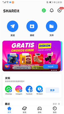 1、打开茄子快传官方正版,进入应用主界面,包括首页、发现、游戏和我的四大栏目
