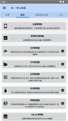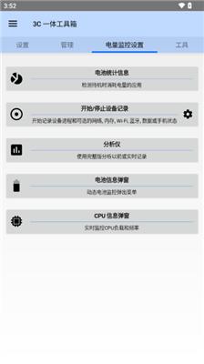 1、进入3C 一体工具箱,我们可以看到“设置、管理、电量、工具”四大板块,每个板块下都是具有很多功能的