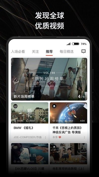 新片场手机版是一款将诸多功能以最简洁的方式展现在用户眼中的通讯社交软件,在新片场手机版软件里,用户可以随时随地了解不同功能的应用以及设置,获得最佳的使用便捷性。同时,有专业细致的匠心,帮助了解其中的情况,在这里发现全球优质视频,每日得到良好的原创作品极力推荐,高清视频等你来看,赶快来下载软件体验吧!