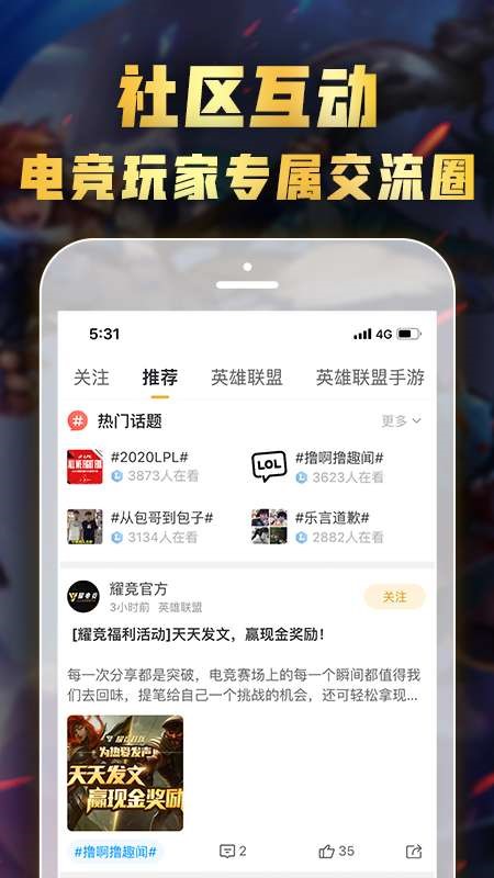 2、app为用户带来丰富的讨论话题,从官方活动、比赛热点到选手八卦、游戏攻略,你都可以在这里看到,尽情参与互动,畅所欲言