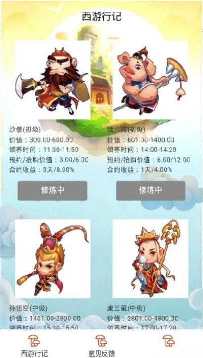 西游行记APP是一款全新的养殖手赚软件,用户可以通过领养西游记中的人物来升级赚钱,唐僧,孙悟空,悟净,悟能,每一个都有不同的收益,等级越高收益也就越大,还可以通过和好友进行交易来赚钱,每天轻轻松松就可以获得奖励,还可以邀请好友赚佣金,赶紧下载试试吧。