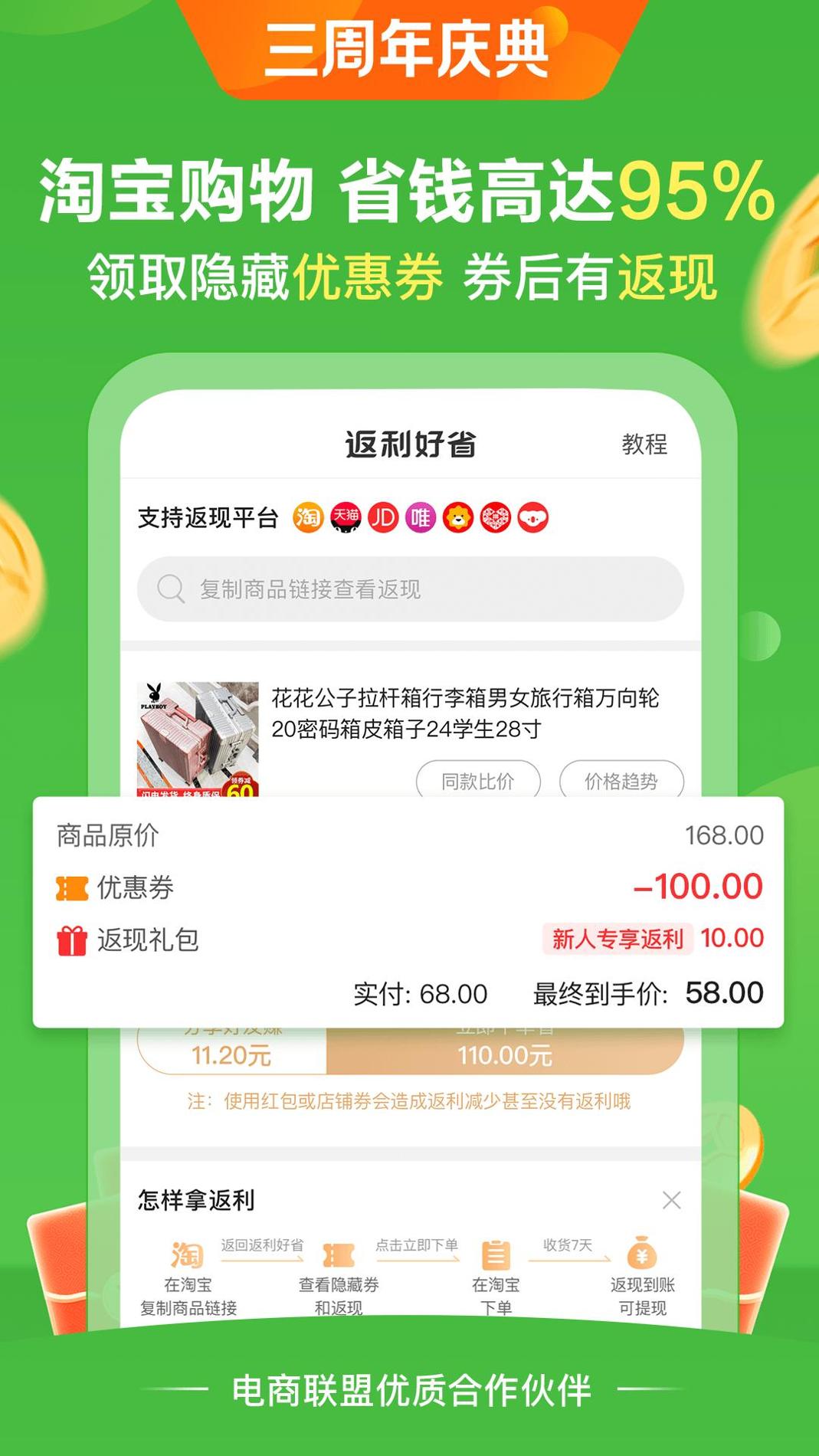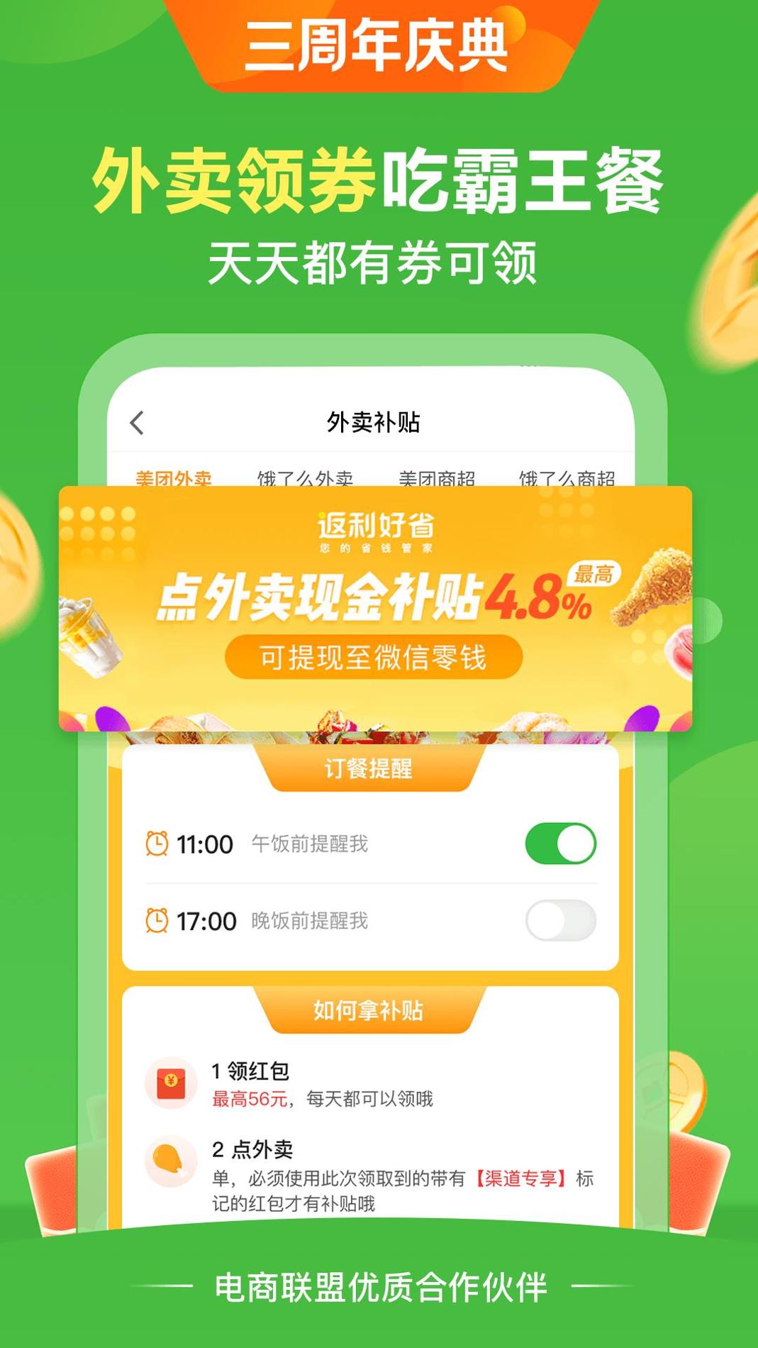返利好省app是一款非常好用又便捷的手机线上商城优惠购物平台软件,在软件当中,用户将能够去使用该软件去进行线上的优惠购物,软件里面用户能够去使用软件来领取大额的优惠,软件的优惠力度十分大。软件的功能强大,能够便捷用户的使用,欢迎广大用户进行下载返利好省。