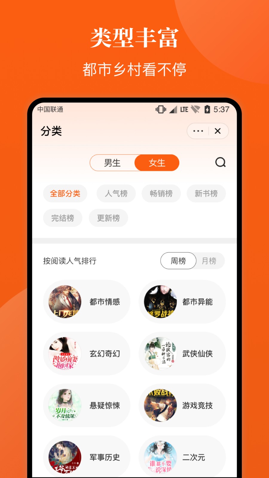 2、可以直接查看不同的小说题材,让用户看书变得轻松简单,方便使用。