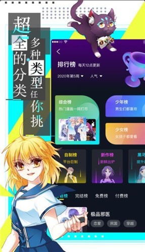 1.超多原创漫画作品任你免费看,各类型的漫画应有尽有,分类齐全