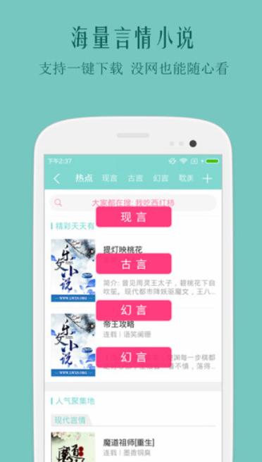 3、提供海量言情小说在线搜索阅读,支持一键下载全本,没网也能随心看,随时随地阅读你喜欢的内容