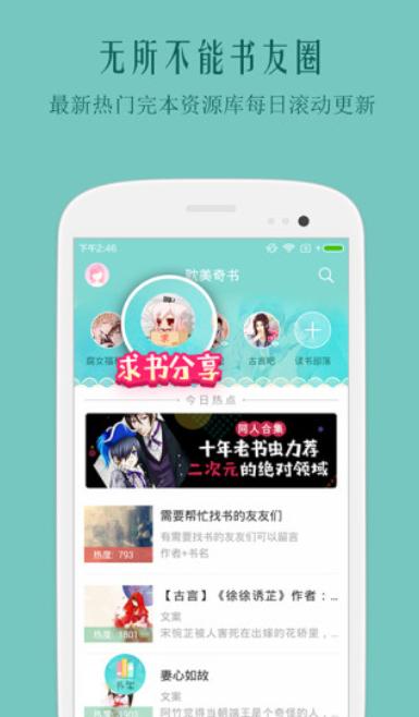 1、全新书友互动平台,可以讨论各种热门话题内容,分享看过的佳作,还可以在线一键求书,拒绝书荒
