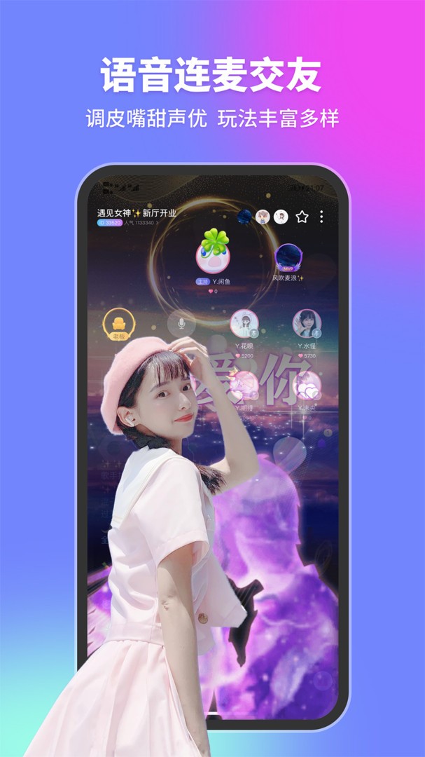 1.真人连麦。高颜值的小哥哥小姐姐们都在语音房间里连麦交友,赶紧加入吧!