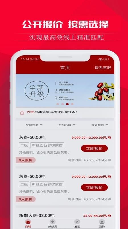 买卖红枣app是一款致力于红枣交易的平台交易,致力于协助全国性所有红枣买卖双方迅速达成交易,推动红枣交易制造行业的迅速发展趋势;服务平台提供购置服务项目,主页系统软件正在推荐最新红枣货运信息,这里只需要挑选条件对所有货运信息开展挑选就能精确找到要想的红枣,接着只要挑选红枣公布采购单就可以了,经销商会在提交订单以后马上送货。