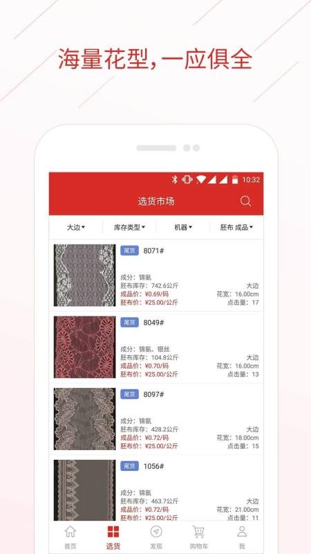 辅布司app是一款专业的蕾丝库存尾货现货市场服务平台,让有需要的批发商与供应商可以迅速完成买卖,致力于推动蕾丝制造行业的买卖发展趋势;服务平台聚集很多货运信息,这里用户能够寻找不同花纹、色调、规格型号的蕾丝一手货源,无论你对蕾丝商品有一切要求都能轻轻松松寻找合适的一手货源,另外系统软件显示信息制成品价与胚布价供你挑选一手货源种类,如果令人满意则立即放进加入购物车购买,助你迅速完成一手货源买卖。
