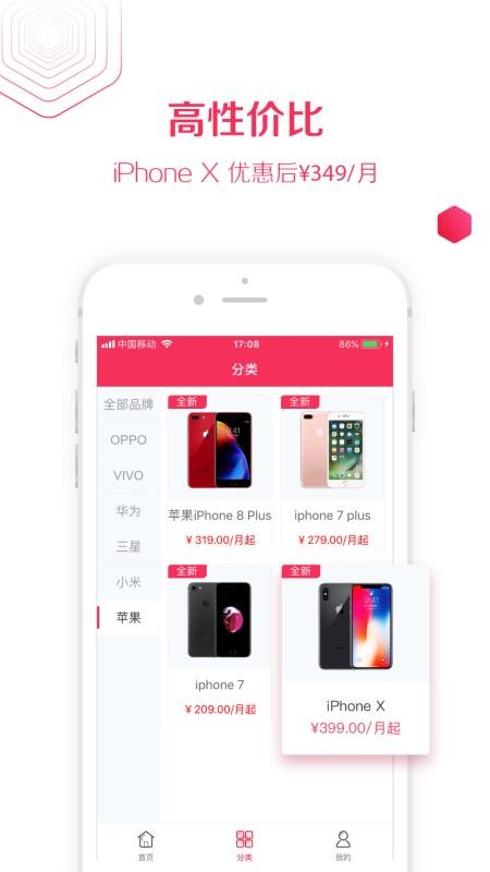 高性价比,iphoneX优惠后349元/月起,商品分类全面;