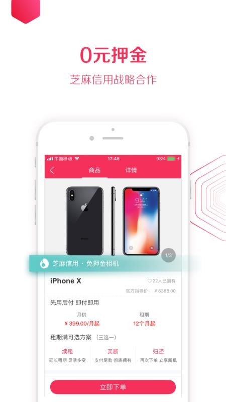 商品租赁0元押金,芝麻信用战略合作,通过信用租机;