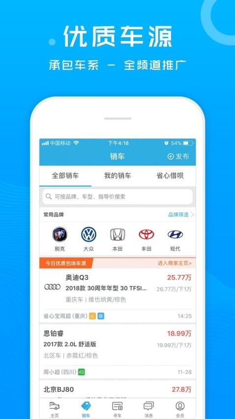 随时随地公布销车信息内容,为你卖车提供方式;集聚很多潜在用户,为你提供很多的客源;网上公布供求信息,已有汽车经销商联系你;随时网上选车,令人满意的话能够网上立即买车;提供暖心物流配送服务,为你提供健全的交易保障。