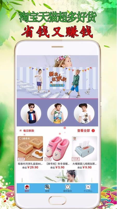 人人省钱app是一款能够让众多网上购物客户购物省钱的系统软件,app与淘宝网、天猫商城、拼多多平台等一线电子商务平台协作,内置很多超大金额优惠券等着你领取,相对性比立即购买最大能够节约90%之上,给你每一次购物都是有优惠,都能享有优惠;服务平台中发布的每天打折商品,优选每个人都喜爱的受欢迎产品,能够廉价购买,还能领取优惠券,让购物更划得来。