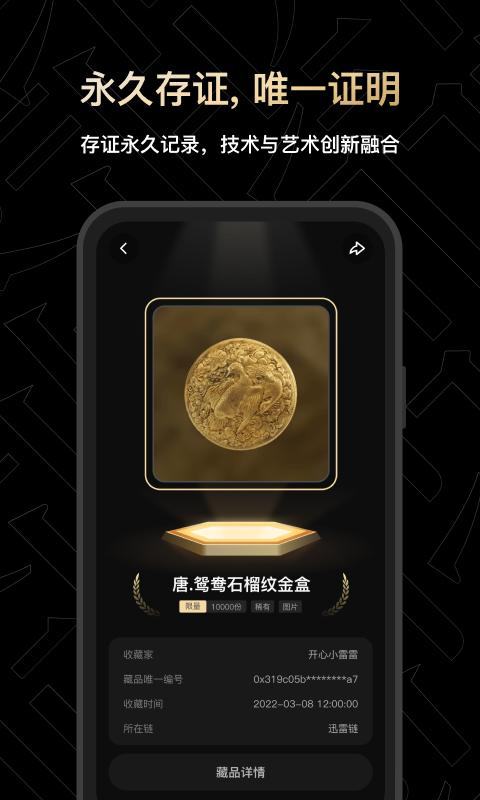 1、是迅雷连锁艺术收藏平台,为用户提供各种文化创意产品的数字收藏。