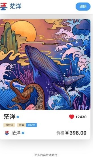 茫洋数字藏品软件中汇集了非常多的数字藏品,藏品都是非常的优质的,帮助用户们可以在这里购买到超级多的数字藏品,海量的藏品都是非常的优质的,为用户们带来专业的购物体验,这里的每个数字藏品都有对应的信息,让用户们可以在这里下载使用,喜欢的话可千万不要错过啦,本软件的功能是非常的强大的,喜欢的话可千万不要错过啦!