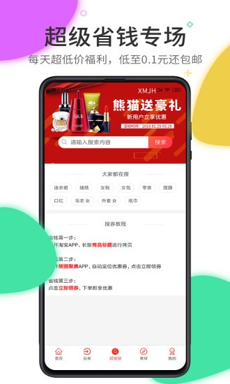 熊猫聚惠是一个为用户提供线上购物服务的购物软件,该平台上有海量的商品,包括了各种类型的,还有大量的商品优惠券,全部0门槛使用,推荐下载!