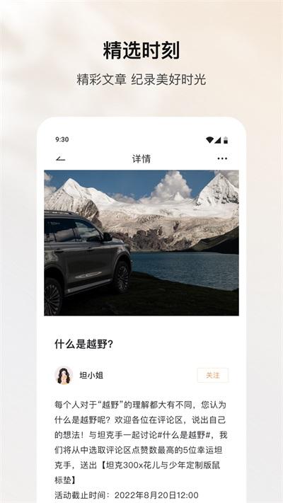 坦克TANK App基于开放多元的内容生态运营,积累了大量社区优质内容及超300+来自户外、摄影、改装等多个圈层的社区达人,用户可以学到到实用满满的干货、还有尊享车主专属福利与各类精彩活动。