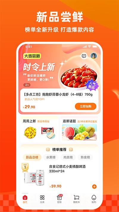 3、在这里小编选择一个超市为例了,选择后进入主页面。超市中的商品和实体店中是同步显示的,有些地方,例如在北京,也可以购买一些高端进口的生鲜产品,有的时候会有很多优惠,很便宜。