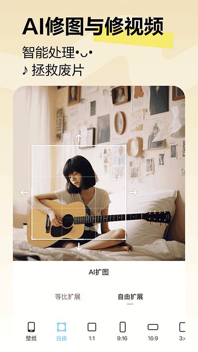 1、同样进入图片美化页面,选择要更改的图片,这次我们点击【编辑】功能,即可进入图片裁剪模式,选择想要裁剪的大小,第一个是自由裁剪,其余的是快速裁剪样式,请根据实际需求来进行调整,设置好后点击【确定裁剪】即可保存图片。